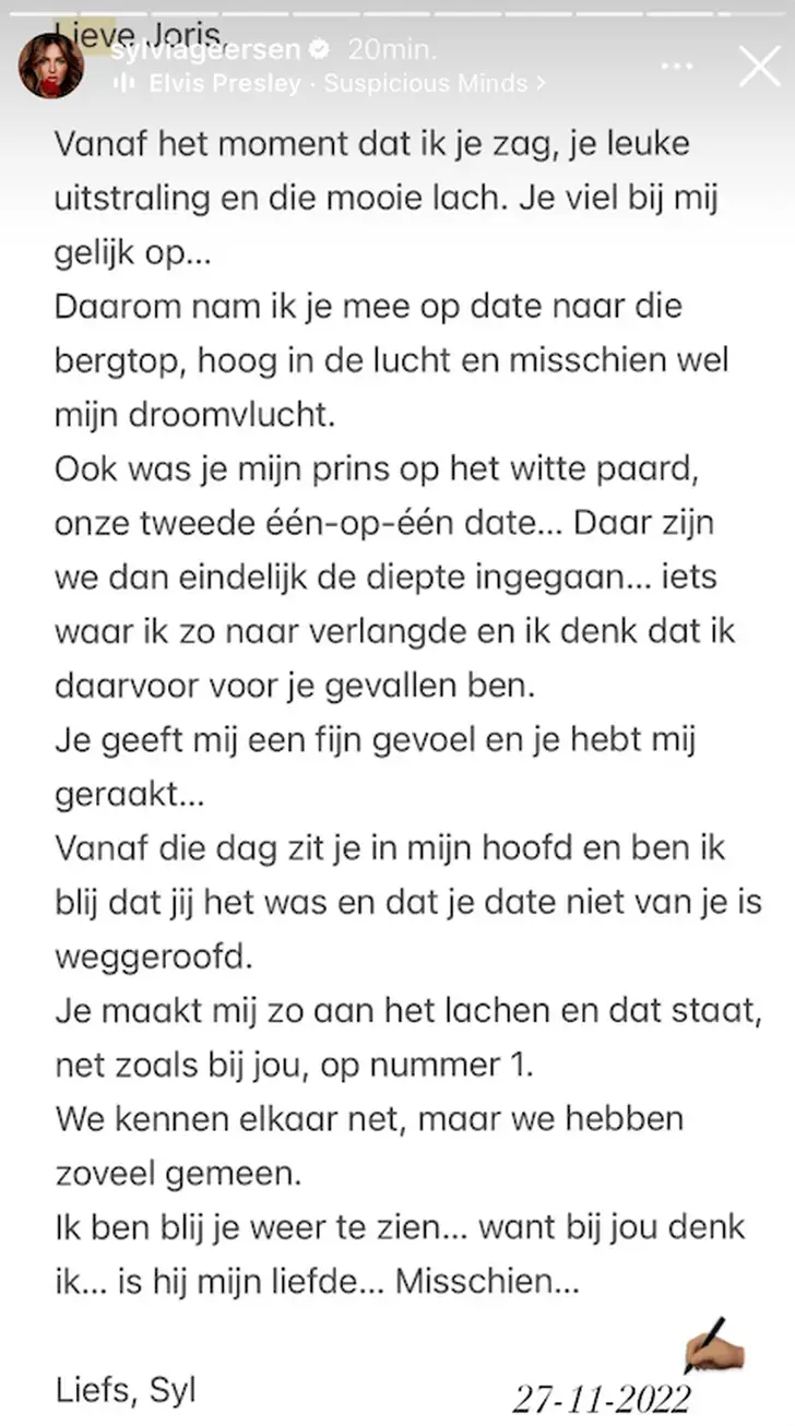 In haar stories deelt Sylvia bovendien een notitie die ze op 27 november 2022 – een dag voor de laatste rozenceremonie – in haar telefoon schreef. "Lieve Joris, vanaf het moment dat ik je zag – je leuke uitstraling en die mooie lach – viel je mij meteen op. Daarom nam ik je mee op date naar die bergtop. Hoog in de lucht en misschien wel mijn droomvlucht. Ook was je mijn prins op het witte paard."