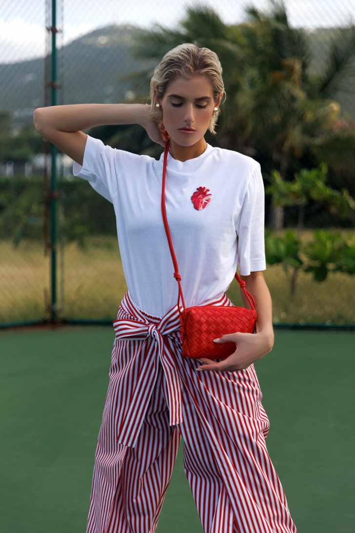 T-Shirt: Free by Oscar Carvallo | Broek: Vilebrequin x Ines de la Fressange | Tas: Bottega Veneta via Carla Saint Barth