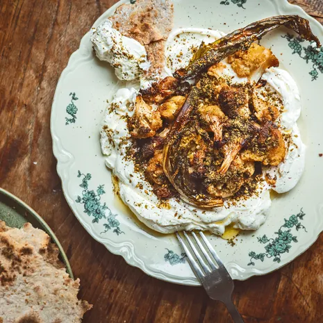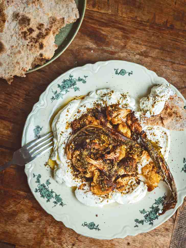 - Spreid met de achterkant van een lepel de labneh uit over een bord en leg de bloemkool erop. Maak af met nog wat olijfolie en de za’atar en serveer met pita of platbrood.