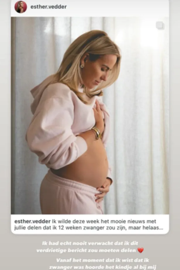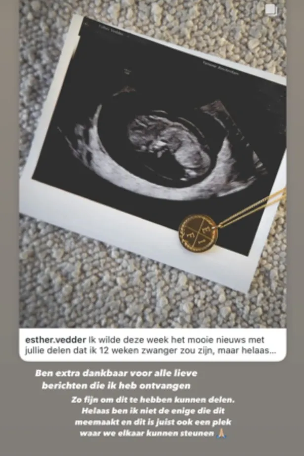 Esther post vandaag twee Stories naar aanleiding van het bericht van gister. "Ik had echt nooit verwacht dat ik dit verdrietige bericht zou moeten delen" begint ze. "Vanaf het moment dat ik wist dat ik zwanger was hoorde het kindje al bij mij", legt ze uit. In de Story die daarop volgt, schrijft de onderneemster dankbaar te zijn voor alle lieve berichten die ze heeft ontvangen. "Zo fijn om dit te hebben kunnen delen. Helaas ben ik niet de enige die dit meemaakt en dit is juist ook een plek waar we elkaar kunnen steunen", concludeert ze.