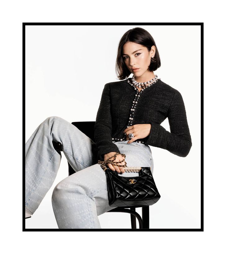 De 11.12-tas in tweed die past bij de silhouetten, de camelia's, de strikken, de tweekleurige schoen die is herzien als platforms of slingbacks met kleine hakken, de manchetarmbanden versierd met dubbele C's... de symbolen van Chanel zijn alomtegenwoordig. Verschillende visuals tonen een scala aan accessoires waarbij elk stuk een kostbaar object is: sandalen met strikken, parelsieraden, mini-gewatteerde tassen, haarspeldjes, zonnebrillen en camelia's vormen een concentraat van de Chanel-allure. We like!