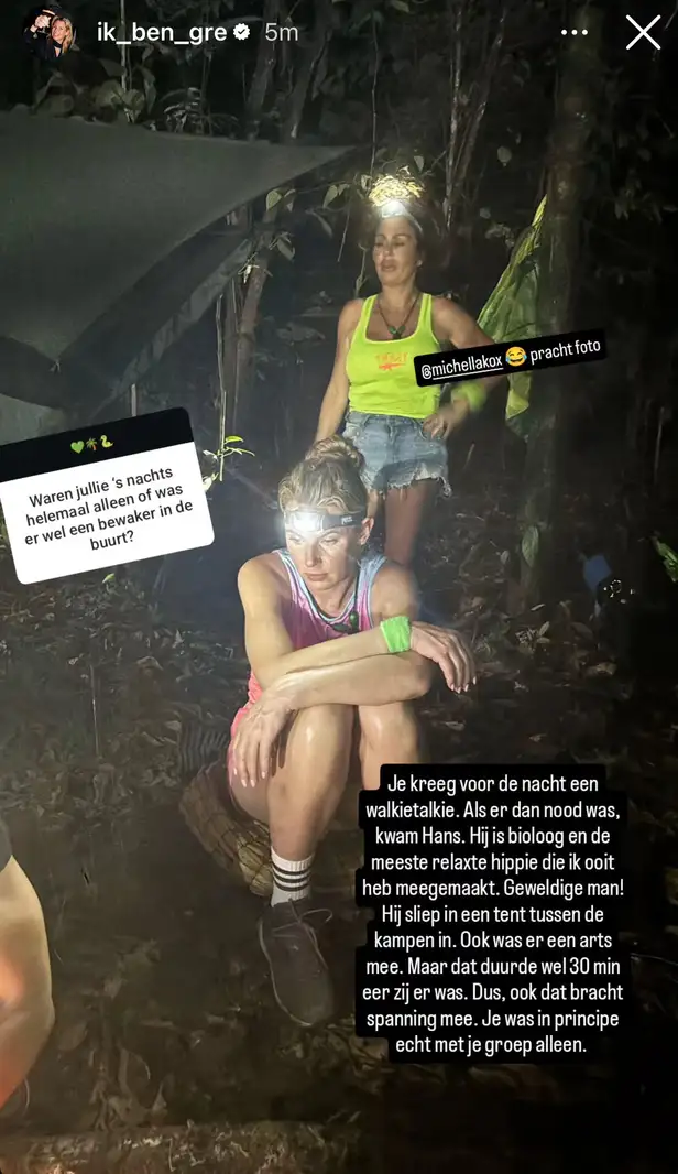 We kunnen ons voorstellen dat het soms best een uitdaging is om te overleven in de jungle. Maar de nachten? Dat is weer een heel ander verhaal. Want wat doe je als het pikdonker is in de jungle en er iets gebeurt? Tijdens een vragenrondje op Instagram stelt een volger van Greetje deze vraag ook. "Waren jullie 's nachts helemaal alleen of was er wel een bewaker in de buurt?", luidt de vraag.