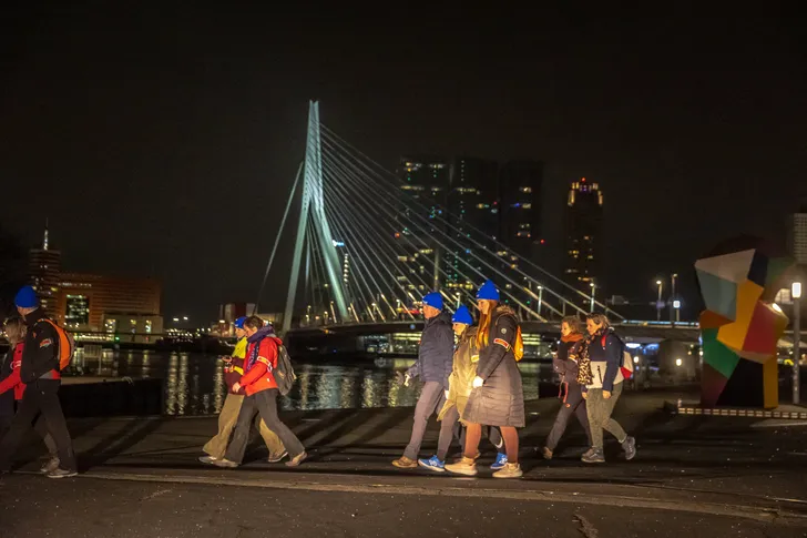 De Nacht tegen seksueel geweld start en finish bij de iconische Laurenskerk in Rotterdam. Onderweg passeren deelnemers onder meer de Erasmusbrug – kleurrijk verlicht voor de gelegenheid. Maar dit is niet alles: langs de route worden wandelaars geconfronteerd én geraakt door kunstinstallaties, performances en activaties die seksueel geweld bespreekbaar maken.