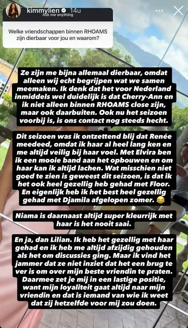 En haar band met Lilian? "Ik heb het gezellig met haar gehad en ik heb me altijd afzijdig gehouden als het om discussies ging. Maar ik vind het jammer dat ze niet inziet dat het een brug te ver is om over mijn beste vriendin te praten. Daarmee zet je mij in een lastige positie", vindt Kimmylien. "Want mijn loyaliteit gaat altijd naar mijn vriendin en dat is iemand van wie ik weet dat zij hetzelfde voor mij zou doen." Duidelijk!